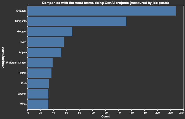 According to this analysis, it's Amazon making the broadest investments in GenAI. They had 228 teams across the company with job posts that mentioned GenAI projects (full company listing).