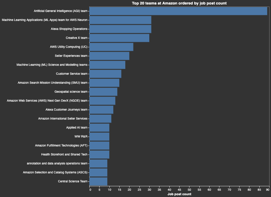 I looked at GenAI projects mentioned in global job posts over the 12 months to October 2024 and extracted which teams are hiring. (See a full feed of GenAI projects on Sumble.) I extracted the team name from those job posts to try and get a sense of where and how broadly they are investing.