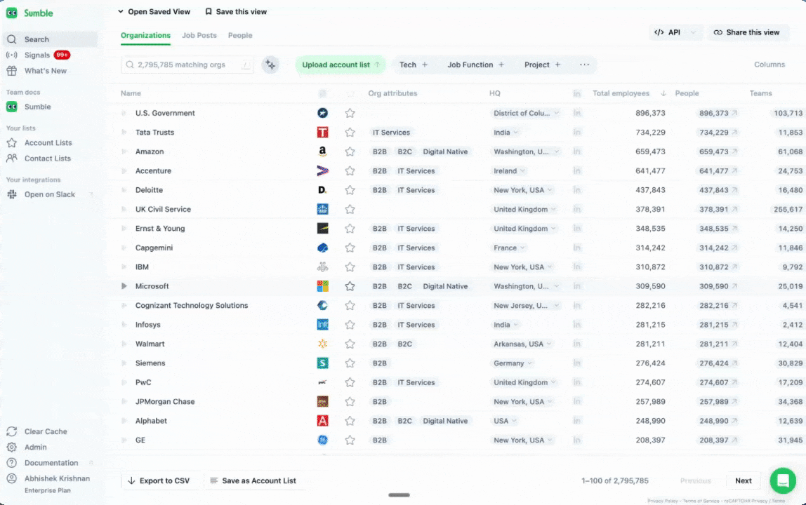 Once your accounts are loaded, Sumble becomes your account planning hub. Every feature below works on your specific named accounts, giving you the depth you need to map the org, identify the buying committee, and build a credible POV before first contact.